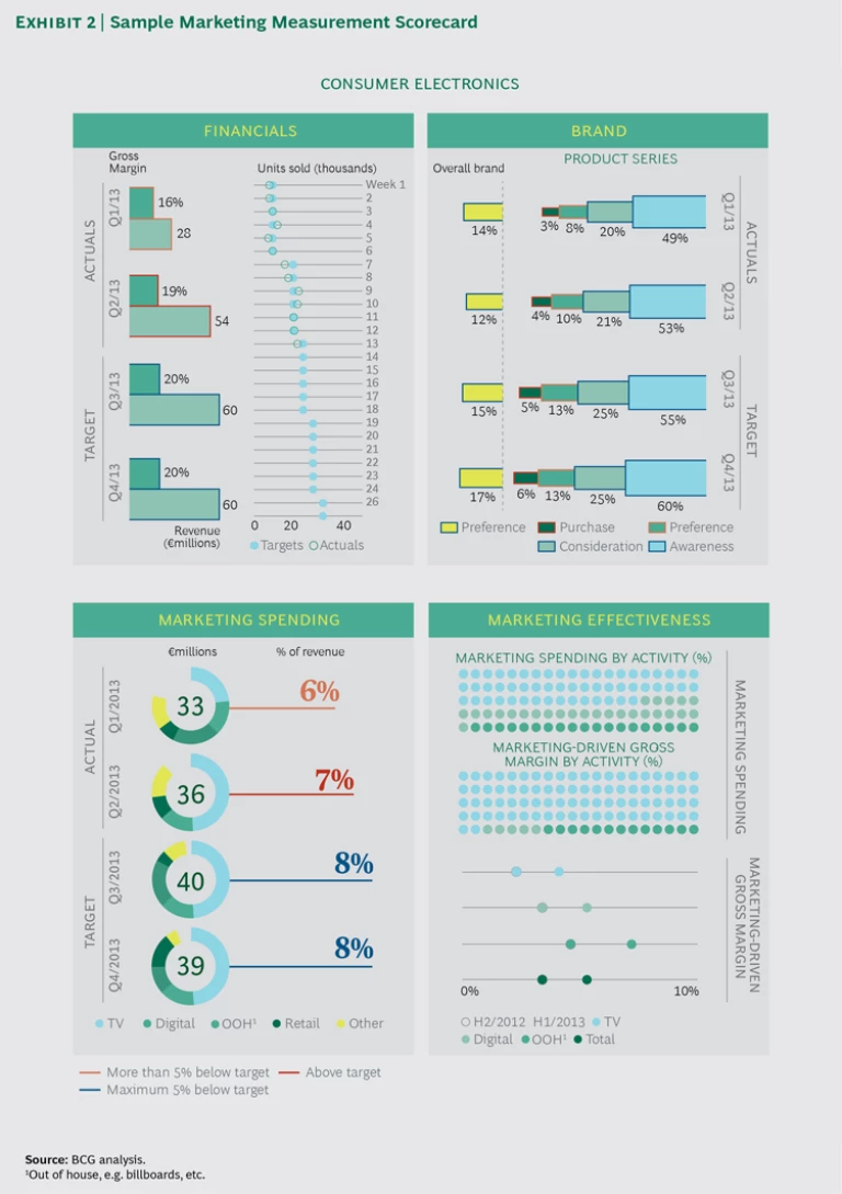 To deliver confidence in the value of marketing, the organization should take a systematic and comprehensive approach to marketing measurement. Metrics and decision tools need to be embedded into the planning processes across the organization; otherwise they will sit on a shelf and not be used. A good first step is to ensure that marketers share a common currency—a standardized set of metrics, typically five to ten, that are consistently reported and that capture short- and longer-term ROI along with a set of key contextual factors for interpreting the ROI performance, such as overall growth, relative pricing power, and share of voice. In addition to providing a means of consistent, regular reporting, a common currency enables the development of a standard toolbox across the business. A single dashboard that tracks key agreed-upon metrics in a consistent manner can be a powerful way to keep everyone focused. (See Exhibit 2.)