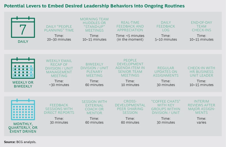 Establish new routines. Armed with knowledge about what works and what doesn’t, frontline leaders can begin to incorporate new routines and rhythms into their days. These new routines will likely include a variety of recurring activities, including regular team check-ins, coaching and mentoring (with peer groups, one-on-one mentors, and subject matter experts, for example), job programs and rotations, and structured and unstructured feedback. (See the exhibit.) The best frontline leaders can serve as trainers and coaches to their peers, helping them incorporate best practices into the daily routine.
