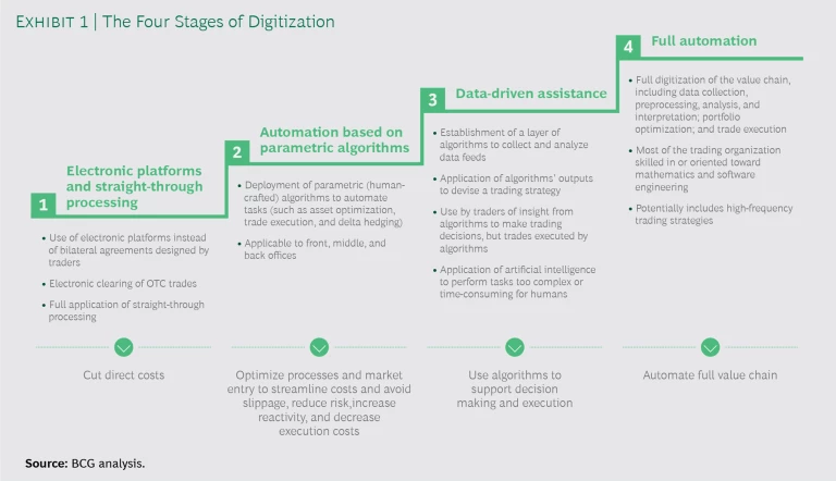 Regardless of how quickly the trading of individual commodities becomes digitized, the directional trend is clear. We see the evolution toward the Holy Grail of full digitization proceeding in four stages. (See Exhibit 1.)