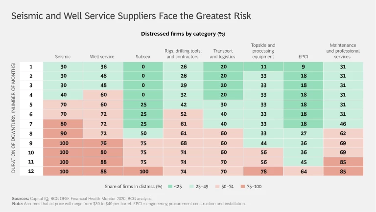- Companies that supply seismic and well services are most at risk of financial distress, and that risk increases as the downturn continues. (See the exhibit.)