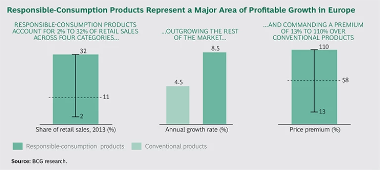 We found that in 2013, RC products accounted for 2% to 32% of total sales in the four categories, for an unweighted average of 11%. (See the exhibit “Responsible-Consumption Products Represent a Major Area of Profitable Growth in Europe.”) More important, the annual growth rate for sales of RC products was almost twice the non-RC rate: 8.5% versus 4.5%. We also found that Europeans are willing to pay a substantial premium—ranging from 13% to 110%, with an average of 58%—for RC products over conventional alternatives.