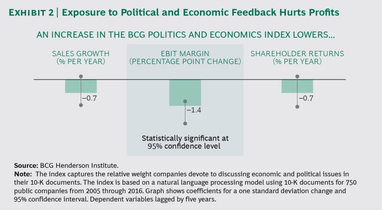 Does it matter? Our research shows that firms that are more exposed to political and economic feedback tend to have lower profit margins. (See Exhibit 2.)