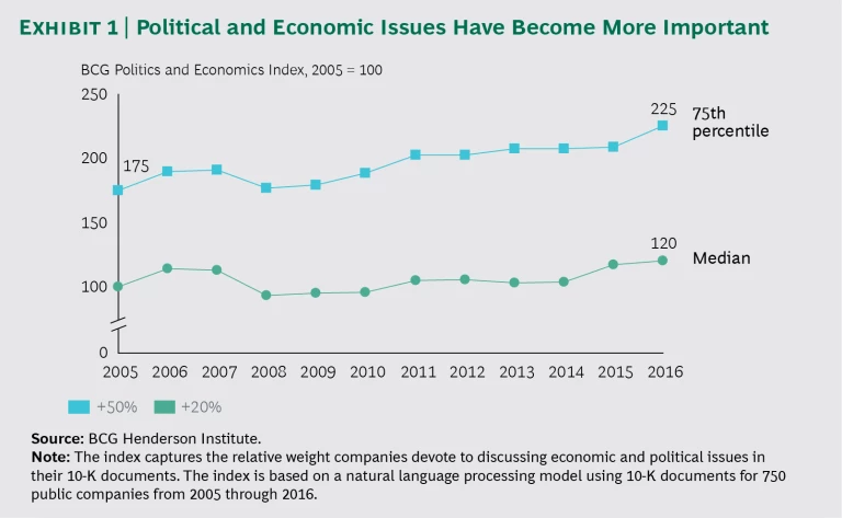 In this tightly intertwined world, companies feel the impact of political and economic factors more acutely. A recent BCG Henderson Institute analysis applying natural language processing (NLP) to S&P 500 companies’ investor communications shows that many executives now devote more attention to reacting to and shaping political and economic issues. (See Exhibit 1.)