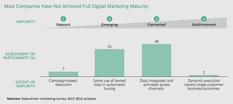 CMOs and their marketing colleagues have the potential to do more to affect corporate results than ever before. Most companies aren’t there yet. Our research into 40 leading international marketers found that though companies are trying to climb the digital curve, the curve gets steeper as it rises, increasing the difficulty of moving to the next level. (See the exhibit.) We rated companies from one to four on their digital maturity with four being “multimoment maturity”—the ability to deliver personalized content to consumers at multiple moments across the purchase journey. Only a few companies have achieved that level. Most cluster around two and three.