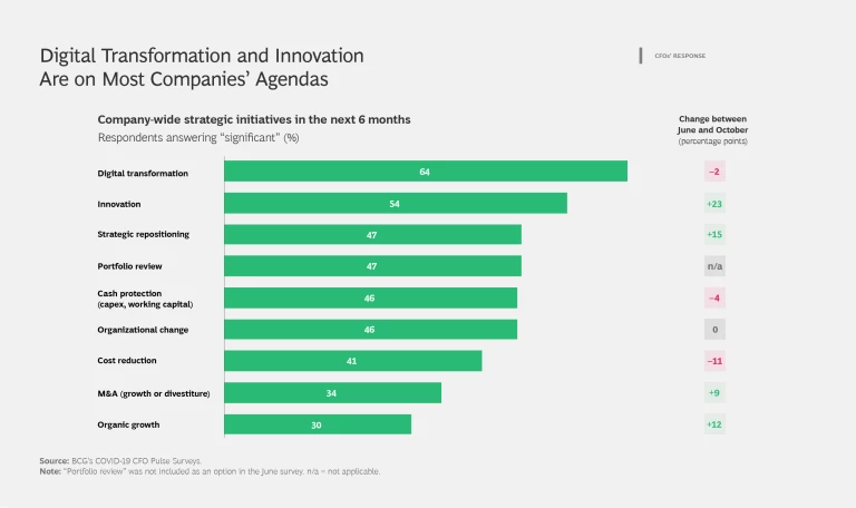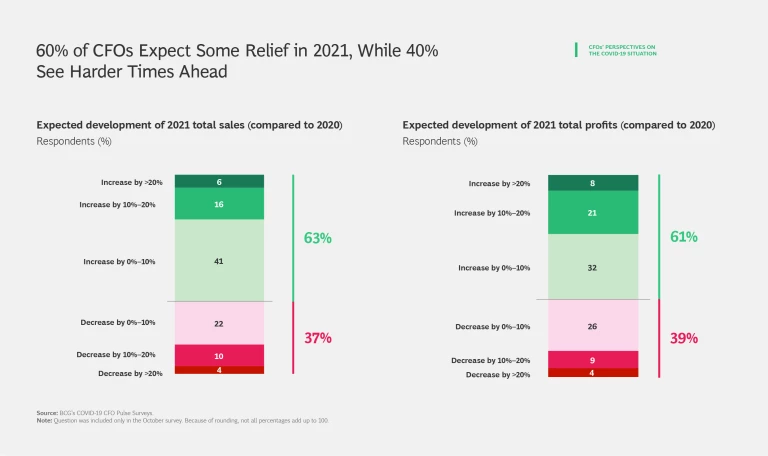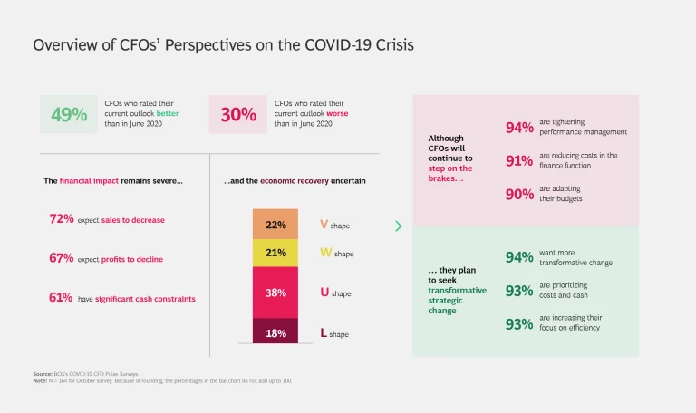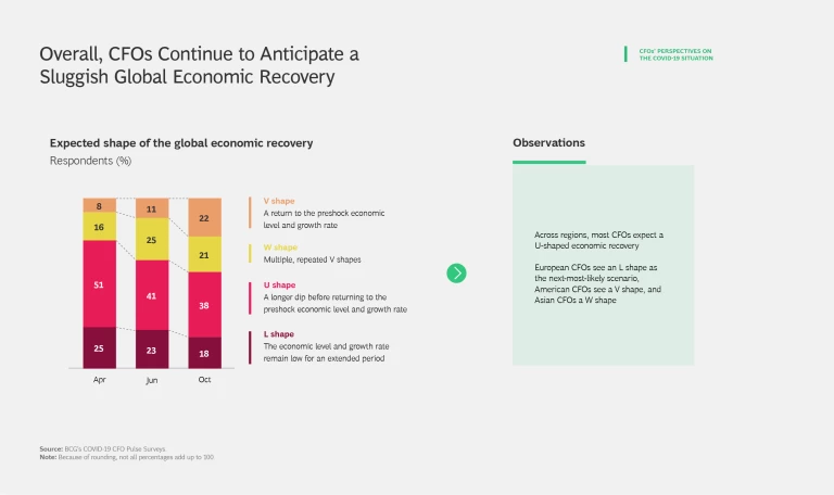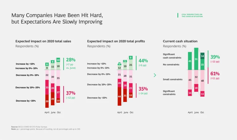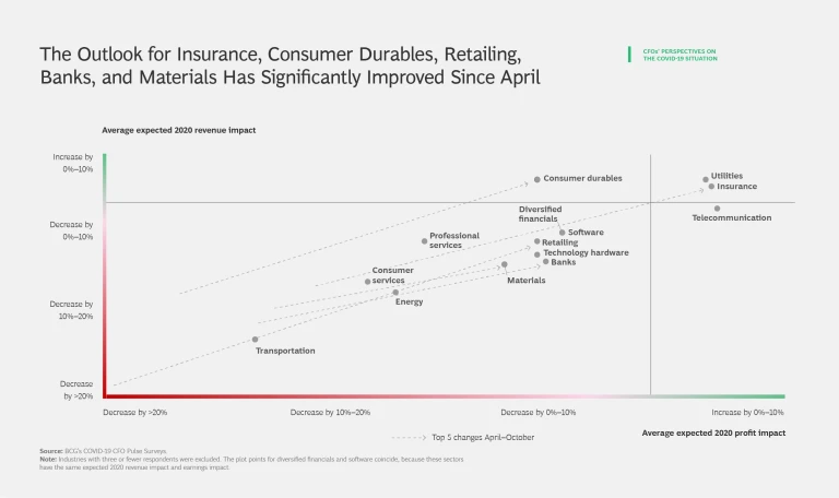 For the third time since the coronavirus pandemic began, BCG surveyed CFOs across the globe to understand their perspectives on the crisis. As in our previous surveys, in April and June, we find a slowly improving outlook across all regions. The tenor of CFOs’ responses differs by sector and geography, however, and indicates some clear winners and losers in the global lockdown. In particular, CFOs from the transportation, consumer services, and energy sectors remain the most concerned about the pandemic’s impact on sales and profits, while the outlook of their counterparts in insurance, consumer durables, and retailing has improved significantly since April.