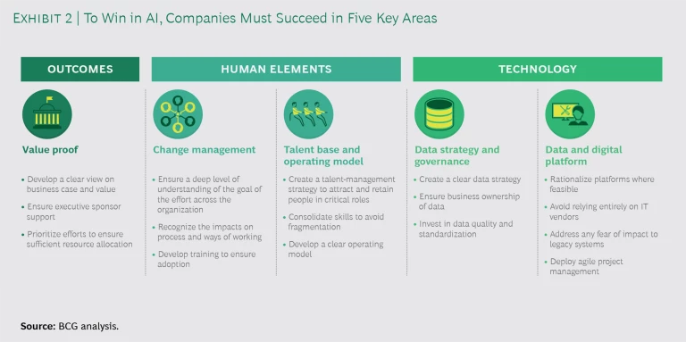 So, what does it take to rack up such results? In general, any company looking to win in the digital age must become bionic—combining technology and the human elements of the business, including new ways of working and talent, to drive a clear set of business outcomes. To win with AA and AI specifically, this means honing capabilities in five areas. (See Exhibit 2.)