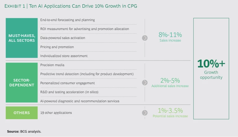 There is little doubt that AA and AI offer significant potential for CPG companies. A 2018 study by BCG and Google identified the ten most promising AA and AI applications in CPG, including end-to-end forecasting and planning along with ROI measurement for advertising and promotional spending. According to the report, companies that deploy these ten applications at scale can boost revenue by at least 10%. (See Exhibit 1.) Given the extremely challenging and uncertain macroeconomic environment, some of those applications will become even more vital, including predictive trend detection and the demand-forecasting, inventory optimization, and supply chain risk-modeling activities within end-to-end forecasting.