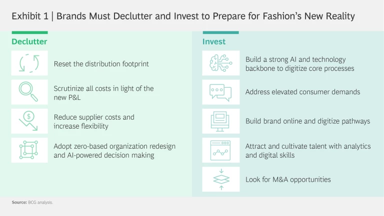 Like companies everywhere, fashion brands initially reacted to the COVID-19 crisis by taking quick steps to ensure employee safety and preserve cash. Now, as economies begin to reopen and consumer sentiments reflect a new reality, brands must act on two fronts. (See Exhibit 1.)