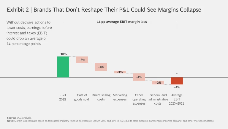 There’s no question that the shape of fashion P&L must change. In fact, we believe that if brands don’t act, margins will collapse. (See Exhibit 2.) Our forecasts show fashion industry sales dropping 30% this year (compared with 2019) and up to 15% in 2021. That could lead to a 14% decrease in earnings before interest and taxes (EBIT) over the same period if a company were to take no action to adapt its cost base to account for the lower sales.
