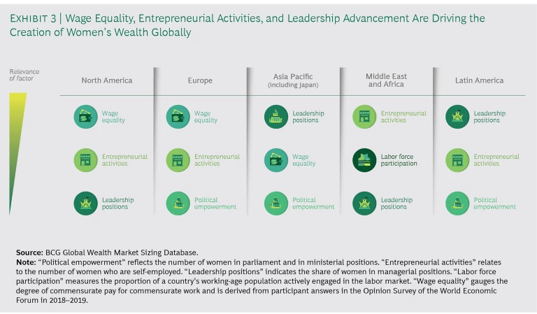 The opening up of the Middle East is further evidence that expanded access to education and health care can have powerful and positive implications for women. Labor force participation, leadership positions, and political empowerment also play important roles in economic advancement. (See Exhibit 3.) Our data shows, however, that these indicators have developed at different rates. Labor force participation has grown much faster than wage equality, for example. Of all the criteria examined, wealth creation for women is most highly correlated with holding high-skilled jobs. For example, women account for roughly 50% of high-skilled workers in North America, compared with around 20% to 40% in most developing countries. 3 3 Source: “ Women and the Wealth of Nations: Toward a Better Allocation of Female Talent,” The Brookings Institute, April 2016. In the future, greater wage equality and higher rates of inclusion in managerial positions and in entrepreneurial roles will be major factors in driving women’s wealth globally.