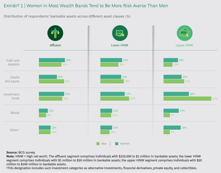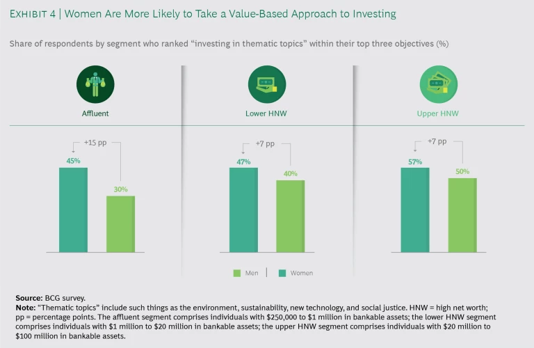 Women are also more likely than men to invest on the basis of their values, favoring funds that not only perform well but also create a positive impact, as opposed to investing solely for performance. Tracey Woon, vice chairman of UBS Wealth Management for the Asia-Pacific region, said “Women do not just want to boost the bottom line; they also want to help develop the communities we live in, by investing in education, health care, and our planet.” In our survey, 64% of women said that they factor environmental, social, and governance (ESG) concerns into their investment decisions. As women accrue greater wealth, such topics factor even more heavily in their thinking. (See Exhibit 4.) Men, by contrast, tend to place more emphasis on pure performance: 96% of males in our survey said that they invest to increase their income and that they base their investment decisions on an asset’s track record for growth and yield. Madeleine Sander, chief financial officer of the German private bank Hauck & Aufhäuser, said, “Female and male investors differ in their investment approach. While women tend to prioritize risk reduction and doing good, men place a stronger focus on historical performance and the process for individual stock picking.” Steph Wagner, director of women and wealth for Northern Trust, added, “Wealth managers continue to assume that language around performance resonates with men more than women, when actually both genders value performance. However, women are more likely to push back and ask questions to better understand its impact on their short-term and long-term goals.”