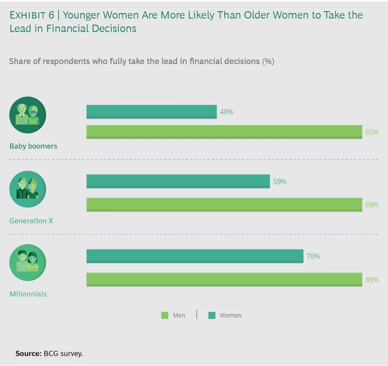 Younger women are more financially literate than older women, our survey shows, and that literacy translates into greater confidence and empowerment. An impressive 70% of millennial women (those born between 1980 and 1995) said that they take the lead in all financial decisions, compared with just 40% of female baby boomers. (See Exhibit 6.) That independence endures even as millennials marry. Unlike most women of past generations, 66% of married millennial women remain involved in financial decisions; the corresponding figure for female baby boomers is 29%. In all, our research found that gender-based differences in investor behavior and attitudes diminish as generations get younger, with millennial men and women sharing similar views, including a shared preference for purpose-driven investing in ESG and related topics.