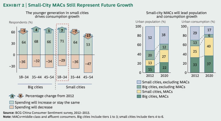 Nonetheless, small-city MACs remain the best drivers of future population and consumption growth in China. At present, their numbers and their spending are smaller than big-city MACs, but by 2020, they will make up 27 percent of the urban population (compared with 22 percent for big-city MACs) and a solid 40 percent of urban consumption (versus 37 percent). Though consumer sentiment among them is down this year, the dip is temporary. In keeping with the pattern already playing out in big cities, sentiment will bounce back once the economy has stabilized.