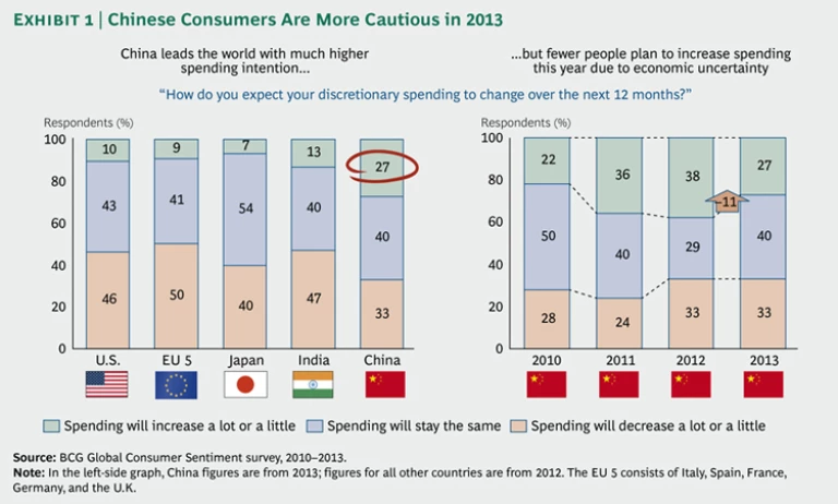 However, with the recent slowdown in China’s previously hyper-fast economic growth, Chinese consumers have become more cautious. (See Exhibit 1.) While 27 percent of Chinese consumers plan to spend more in 2013, that is an 11 percent drop from last year’s 38 percent.
