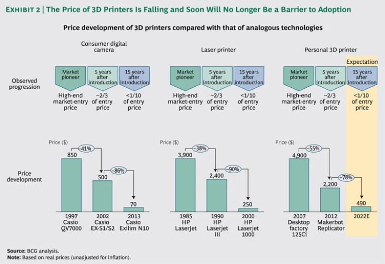 Consider some of the trends already in place. Following a trajectory similar to that of digital cameras, photo-finishing equipment, and conventional laser and inkjet printers, prices of 3D printers, for both industrial and consumer use, continue to fall. Soon price will no longer pose a hurdle for first-time buyers. (See Exhibit 2.) Some industry watchers believe that prices for entry-level machines, in fact, could fall below the psychologically crucial $100 level within the next two or three