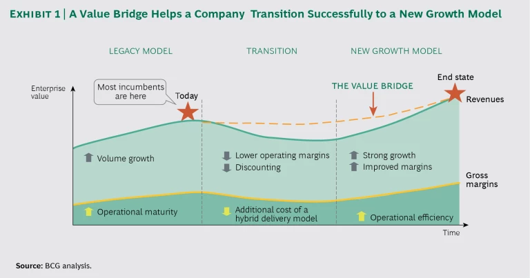 To succeed, companies must first come to terms with a harsh reality: transitioning to a new growth model is inherently difficult and, at least in the short term, can actually drive down revenues and gross margins. Among the factors that affect performance are lower operating margins, the need to discount new offerings, and the additional cost of having to operate with several business models concurrently. Investors are inclined to punish a company for such performance problems by reducing its valuation—unless the company reassures them that it can weather the transition period. By building a value bridge, a company can convince investors that it will succeed in reversing the initial downward trend and will capture the benefits of strong growth, higher margins, and greater operational efficiency. (See Exhibit 1.)