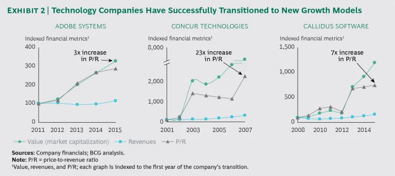 We studied three software companies—Adobe Systems, Concur Technologies, and Callidus Software—that stand out for their ability to raise valuation multiples by successfully managing a transition. (See Exhibit 2.) Each of these companies has transitioned from a licensing to a software-as-a-service (SaaS) model.