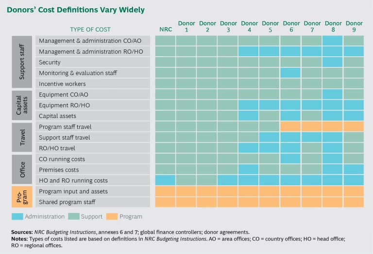 Similarly, a comparison of the documentation requirements of the NRC’s nine main donors reveals eight different sets of definitions of administration and support costs. The definitions govern how the NGO should categorize its expenses in such areas as management and administration, monitoring and evaluation, capital assets, program and support-staff travel, and office costs. (See the exhibit.) By a conservative estimate, if the NRC’s main donors used the same definitions, the organization would save about 29,000 hours in cost accounting alone. Multiplied by the 27 largest NGOs in the NRC’s peer group, the amount of time saved across the sector would be 783,000 hours per year.