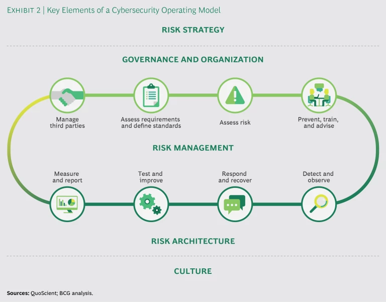 There is little value in an approach geared to isolated incidents or regulatory findings. Instead, banks must holistically rethink their organizational capabilities. That means instituting a dedicated operating model and providing CISOs and executives with a framework for information security risk management. (See Exhibit 2.)