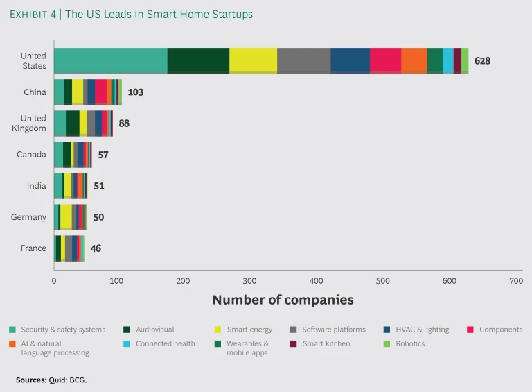 Startups require experienced employees, investors, and suppliers, so the local environment counts for a lot. Startup ecosystems centered on smart-home technologies appear to be forming largely in the US, China (in the city of Shenzhen), and the UK—with the US far ahead at this point. (See Exhibit 4.) Of smart-home businesses founded within the past ten years, most are based in Silicon Valley, London, and New York.