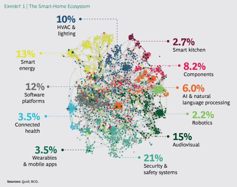 To increase our understanding of this fluid but increasingly significant sector, BCG partnered with Quid, a software and services company whose unique visualization tool (also called Quid) employs artificial intelligence (AI) to draw connections within large sets of text data. For our analysis, Quid identified roughly 1,500 players in the smart-home ecosystem, from Google Nest to Redback, a three-year-old startup that lets users store solar energy for use in the home, and BrainCo, another three-year-old company, which has designed a wearable device aimed at helping people raise their attention level and efficiency. (See Exhibit 1.)