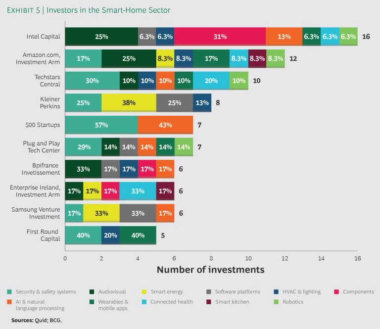 A string of institutional investors and corporations have been investing in the smart-home market. (See Exhibit 5.) By a large margin, Intel Capital is the most active investor, followed by Amazon with investments made primarily through its Alexa Fund, which focuses on companies developing Alexa-compatible technologies across a variety of categories—everything from personal robots to baby socks that monitor an infant’s breathing and heart rate.