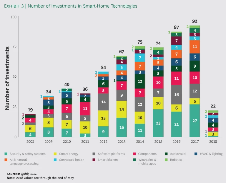 Because of the growing popularity of AI in the form of smart speakers, the artificial intelligence and natural-language category has seen a marked increase in investment activity since 2012. (See Exhibit 3.) That makes sense given the rising popularity not only of Alexa and Google Home but also of Apple’s Siri and other voice assistants. The single largest investment in smart-home AI technologies so far was the $50 million venture round that Rokid, a Chinese company specializing in AI development and robot research, raised in 2016.