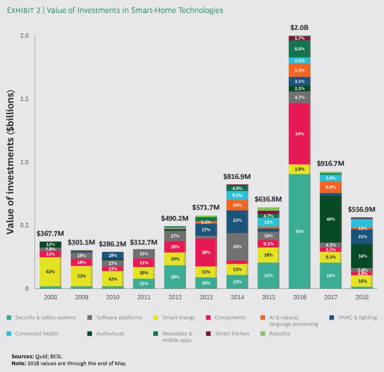 One more active category of investments is the security and safety systems market, which has seen a consistent flow of dollars over the past ten years. That’s to be expected given that home security has always been a consumer priority, and connected devices offer an efficient means of maximizing safety and security.