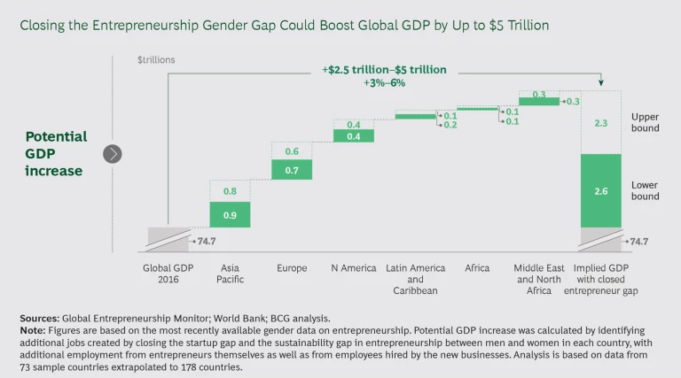New analysis by Boston Consulting Group (BCG) shows that if women and men participated equally as entrepreneurs, global GDP could rise by approximately 3% to 6%, boosting the global economy by $2.5 trillion to $5 trillion. (See the exhibit.) However, unleashing the power of women entrepreneurs will require action from a range of groups, including venture capitalists, nonprofit organizations, and corporations. These efforts must address a critical and at times overlooked issue: the lack of networks that effectively support and mentor women entrepreneurs.