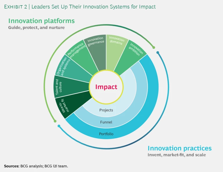 Companies with strong innovation systems do all these things well. But that’s often not enough. Innovation systems are dynamic. They need to be designed and regularly reworked to deliver the desired level of organic profitable growth—but they always need to be seen as a whole. On the basis of our research and experience, we assess innovation systems on ten elements. Seven relate to the innovation platforms and organization that set ambition, define innovation domains, delimit roles, shape portfolios, and measure and reward performance. And three are associated with the actual practice of moving a portfolio of projects to impact. (See Exhibit 2.)