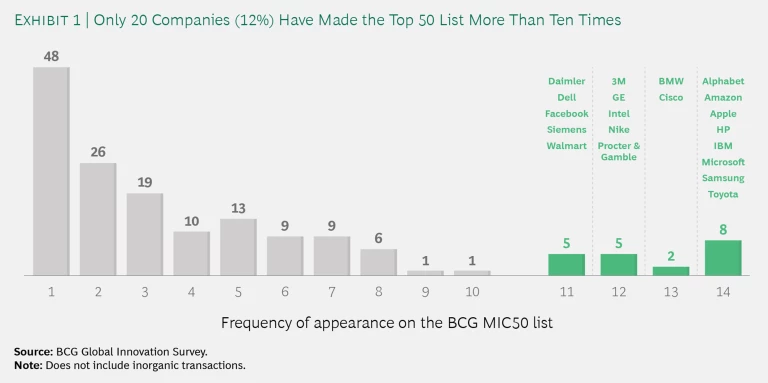 As we mentioned earlier, of the 162 companies that have made BCG’s annual ranking of the 50 most innovative companies since 2005, only eight made the list every year—and only 12% ranked in the top 50 ten or more times. (See Exhibit 1.) Serial innovation is hard. But in the current rapidly shifting customer and competitive environment, it is essential.