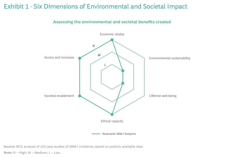 We believe our insights from researching SBM-I can help answer that question. Crossing all industries and geographies, our research analyzed 102 SBM-I initiatives through which companies delivered both business value and environmental and societal benefits. We evaluated each initiative on the basis of its competitiveness and resilience and then tested it against six dimensions of environmental and societal benefits. (See Exhibit 1.) We believe these six dimensions holistically encompass the range of societal value that a business can generate. In fact, in today’s business context of increasing concerns about environmental and societal issues, a resilient and competitive business model must optimize for both business and social value. Generally, the traditional thinking on business model innovation has not sufficiently or rigorously incorporated how business models create value for stakeholders and the common good.