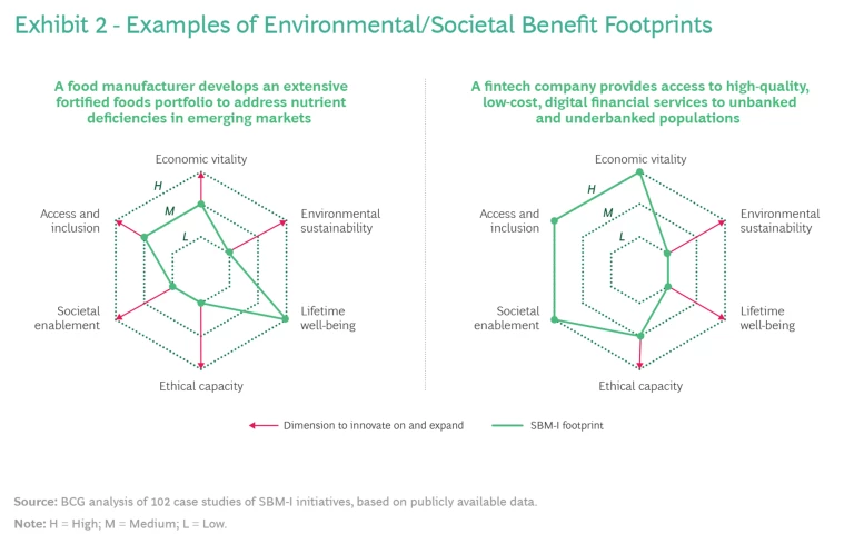 By innovating to expand their scores across all six dimensions, companies can grow their environmental and societal benefit, the basis for new value creation and competitive advantage. They can also future-proof themselves against environmental and societal shocks and shifting trends. For example, a consumer packaged goods company could increase its portfolio of nutritious foods (lifetime well-being) while sourcing closer to its processing centers, thus providing more employment near its customers (economic vitality) and reducing transportation-related emissions (environmental sustainability). Similarly, a fintech that provides microfinance and already facilitates access and inclusion could also mitigate the carbon emissions from its servers or constrain debt-inducing consumption patterns and nudge microloans toward “green” goods and investments, thus boosting ethical capacity and environmental sustainability. Exhibit 2 shows the environmental and societal benefit footprint for two companies seeking to improve their track records.
