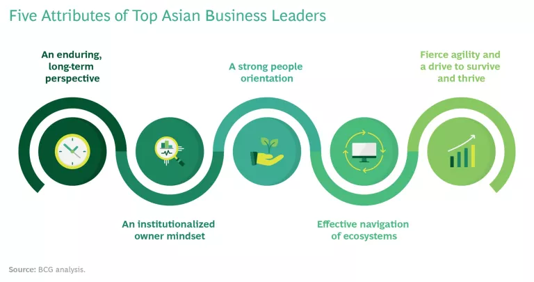 In our conversations with Asian business leaders, we identified five characteristics that have played a part in their careers and helped them steer their companies to success. (See the exhibit.) Here’s a look at those characteristics and how different leaders embody them.