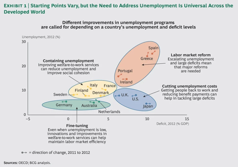 Few issues facing governments are as challenging—or as important—as reducing unemployment. Unemployment is a stubborn issue in many countries, but the challenges differ depending on the specific country’s economy, employment opportunities, and skills base. Many rich countries are confronted by the twin perils of large budget deficits and high unemployment in the wake of the global financial crisis. (See Exhibit 1.) Developing countries, meanwhile, are just starting to shoulder the responsibility of supporting the unemployed and are searching for where to begin.