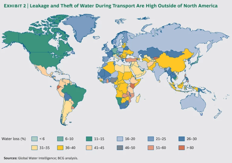 Another challenge with water as a waste conveyance mechanism, especially in Africa, is that most water utilities lose between 30 and 60 percent of their potable water as a result of leakage or theft during transport to end users, compared with only 11 to 15 percent in the U.S. and Canada. (See Exhibit 2.) These loss rates drive the cost of water higher. Even South Africa’s system, which is one of the best in Africa, loses 26 to 30 percent of its water volume to leakage and theft.