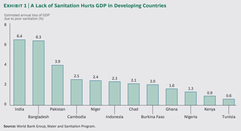 Investments in sanitation dramatically improve a city’s quality of life. Removing fecal sludge from the environment and properly treating human waste reduce a city’s pollution levels, eliminate the foul odor of open drains, and help curb disease outbreaks. Making better sanitation a priority pays off: low-income countries that invest in clean water and sanitation achieve annual average GDP growth of 3.7 percent, compared with only 0.1 percent for those that don’t. Nations that do not prioritize sanitation pay a significant economic price—in some cases, a loss of more than 6 percent of GDP. (See Exhibit 1.) According to the World Health Organization, just one dollar invested in water quality and sanitation yields an economic return of anywhere from $5 to $28, depending on the country. For these reasons, sanitation services are indispensable to a city’s development and competitive advantage.