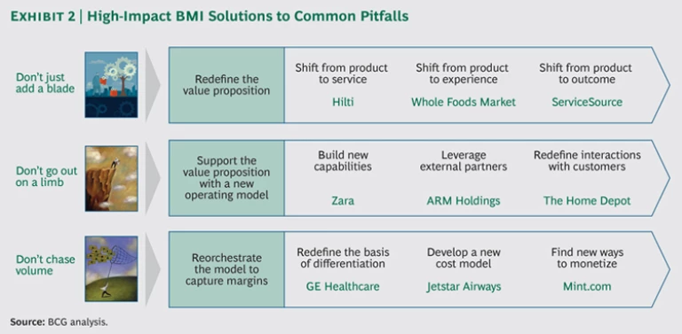 Consider the chasing-volume pitfall. Rather than just reducing the price, companies could also redefine their offering (such as a simplified product with cheaper materials), build a new cost model (such as greater automation and outsourcing), or fundamentally change the revenue model (such as a shift from one-time purchases to smaller, ongoing fees). Or they could do some combination of all three. By using this essence of BMI, we have developed nine particularly high-impact BMI solutions for avoiding typical growth-strategy pitfalls. (See Exhibit 2.) These solutions, and the examples we provide to illustrate them, can lead to a fundamentally new business model.