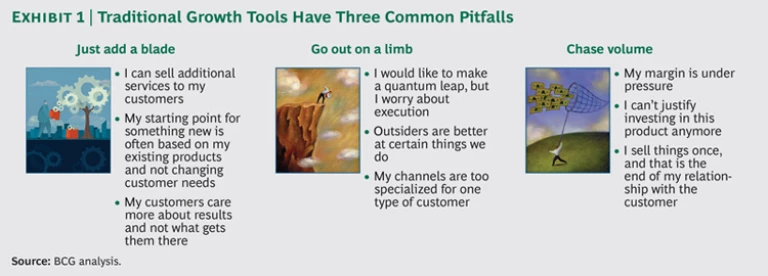 Companies facing these challenges tend to act in similar ways. We have synthesized these into the following three pitfalls, each of which corresponds to a traditional growth lever. (See Exhibit 1.)