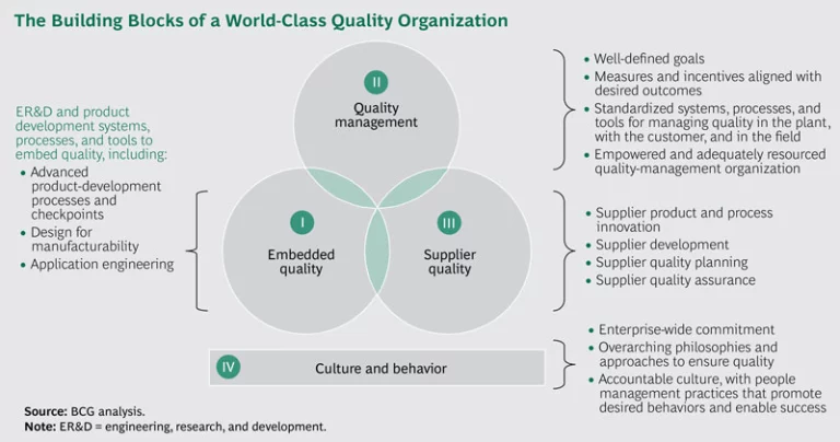 Over the past few years, we have worked with leading automotive companies to assess the maturity of their quality organizations, define gaps in best practices, and put in place programs designed to close gaps and transform the organization. In the course of these experiences, we have found that every world-class automotive-quality organization relies on discrete building blocks. (See the exhibit.)