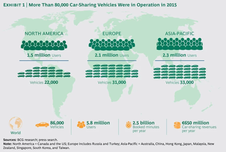 Coverage. Car-sharing services require a critical population mass in order to be profitable. We have found that in Europe and North America, that means a population of at least 500,000. Car sharing in most countries in those regions will therefore be economically viable only in the capital city, or possibly in the three largest cities. In Asia-Pacific, by contrast, where per capita incomes are generally lower and the transportation infrastructure is less developed, car sharing will be economically viable in cities with populations of 5 million or more. Asia-Pacific will nonetheless be the largest market in absolute terms, because of its very large and growing population.