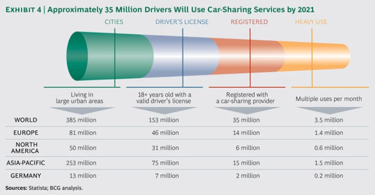 One of the most remarkable developments of the 21st century global marketplace is the rapid growth and evolution of the sharing economy. Today, ordinary people can rent, short-term, everything from luxury handbags to high-end homes to powerboats to designer pets to musical instruments. And also cars. BCG has researched the potential growth of the car-sharing market and estimated its impact on new-car sales in 2021. We found that although car sharing will expand relatively quickly and widely, it will have only a minimal effect on new-car sales, both because most drivers will not forgo car ownership entirely and because some share of lost car sales will be partially offset by sales into car-sharing fleets in large urban areas.