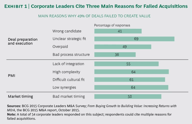 Effective PMI. Many of the reasons for failed acquisitions involve what happens after a deal closes. These include lack of integration, high complexity, difficult cultural fit, and low synergies. Plenty of companies struggle to integrate fully after the deal. Synergy targets that were so enticing in the run-up melt away under the realities of meshing two very different organizations in a short time.