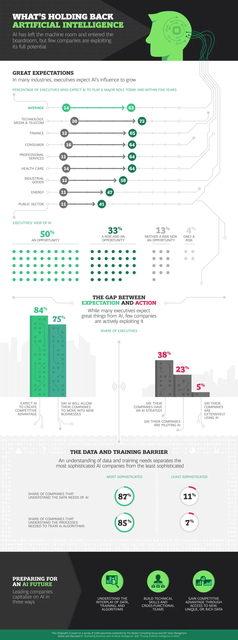 This infographic is based on a survey of 3,000 executives conducted by The Boston Consulting Group and MIT Sloan Management Review and discussed in “Is Your Business Ready for Artificial Intelligence?” and “Putting Artificial Intelligence to Work.”
