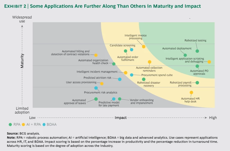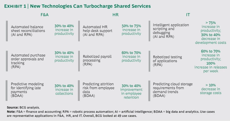 In our study, we looked at 49 use cases: real-world applications of such technologies as AI and machine learning, RPA, natural-language processing, and big data and analytics (BDAA) in shared services that focus on HR, IT, and F&A.