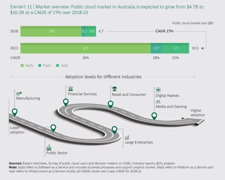Australia is one of the most advanced public cloud markets in APAC. The market is expected to grow from a value of US$4.7 billion in 2018 to US$10.5 billion in 2023, with a CAGR of 17% over the next five years (See Exhibit 11).