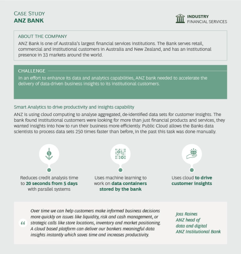 Many financial services players have adopted a cloud-first strategy. Although migration can be a slow process for legacy institutions, banks and other financial institutions are moving peripheral applications onto the cloud. ANZ Bank, one of Australia’s largest banks, is using cloud services to help analyse aggregated, de-identified data sets in order to deliver insights to their institutional customers, a task previously done manually. (See ANZ Bank case study). Some banks are evaluating the advantages of moving their core applications, which would require redesigning their applications as well as adhering to clear regulatory guidelines for how they can treat customer data. Moving their core functions such as foreign exchange platforms, loan approval systems, and leveraging big data and advanced analytics for product pricing, will make it possible for legacy banks to compete with newer financial technology businesses.