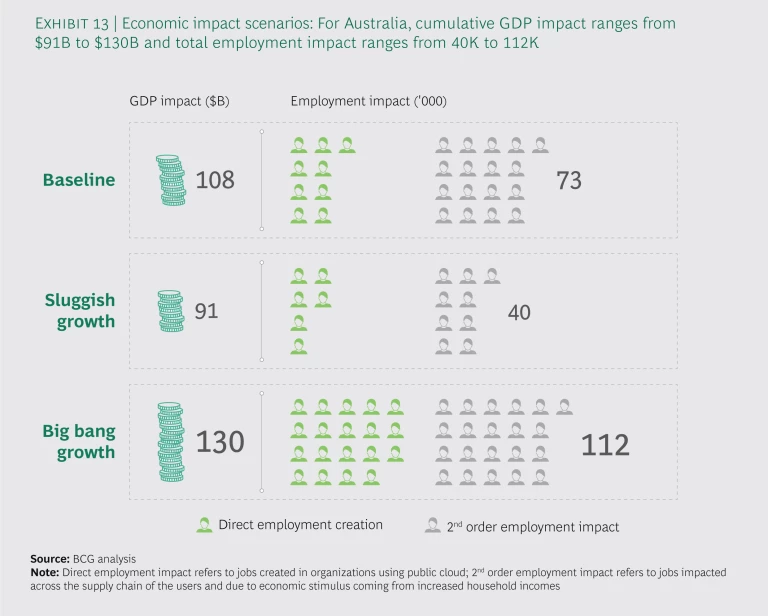 The Big Bang Growth Scenario. Optimal growth would be the result of continued regulatory support and deployment of government applications, combined with the government and CSPs taking measures together to increase the pool of digital talent available in Australia. They would need to invest heavily in IT talent and enhance existing cloud literacy through strong promotion of cloud use.