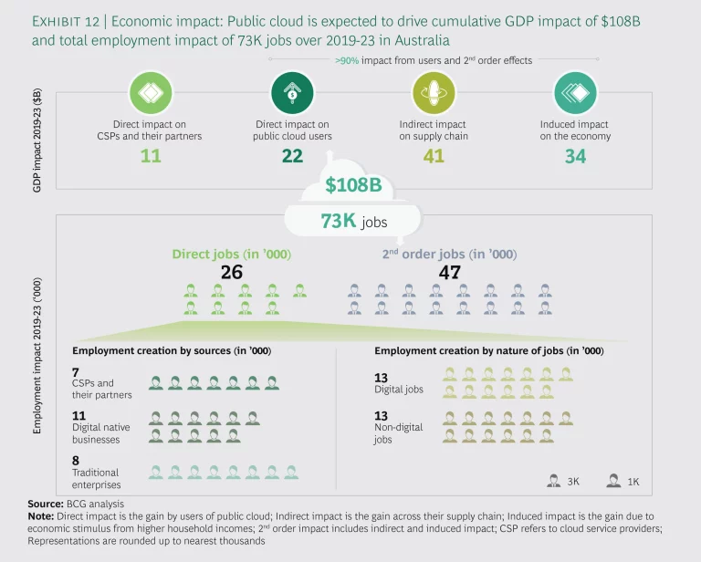 The second order effects are expected to influence another 47,000 indirect and induced jobs, bringing the total potential jobs that are influenced due to public cloud use to 73,000, which is equivalent to 0.6% of the current workforce. A large proportion of these jobs will likely be taken up by the existing workforce after their retraining and upskilling.