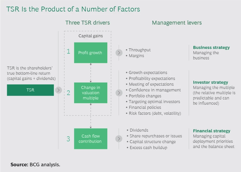 Total shareholder return is measured as the return from a stock investment with the assumption that all dividends are reinvested in the stock. TSR is a product of multiple factors. (See the exhibit below.) Our approach deconstructs TSR into a number of underlying drivers. We use a combination of revenue growth and margin change to assess changes in fundamental value. We then factor in the change in a company’s valuation multiple to determine the impact of investor expectations. Together, these two factors determine the change in a company’s market capitalization and investors’ capital gain (or loss). Finally, we track the distribution of free cash flow to investors and debt holders in the form of dividends, share repurchases, and repayments of debt, and we determine the contribution of free cash flow payouts to a company’s TSR.